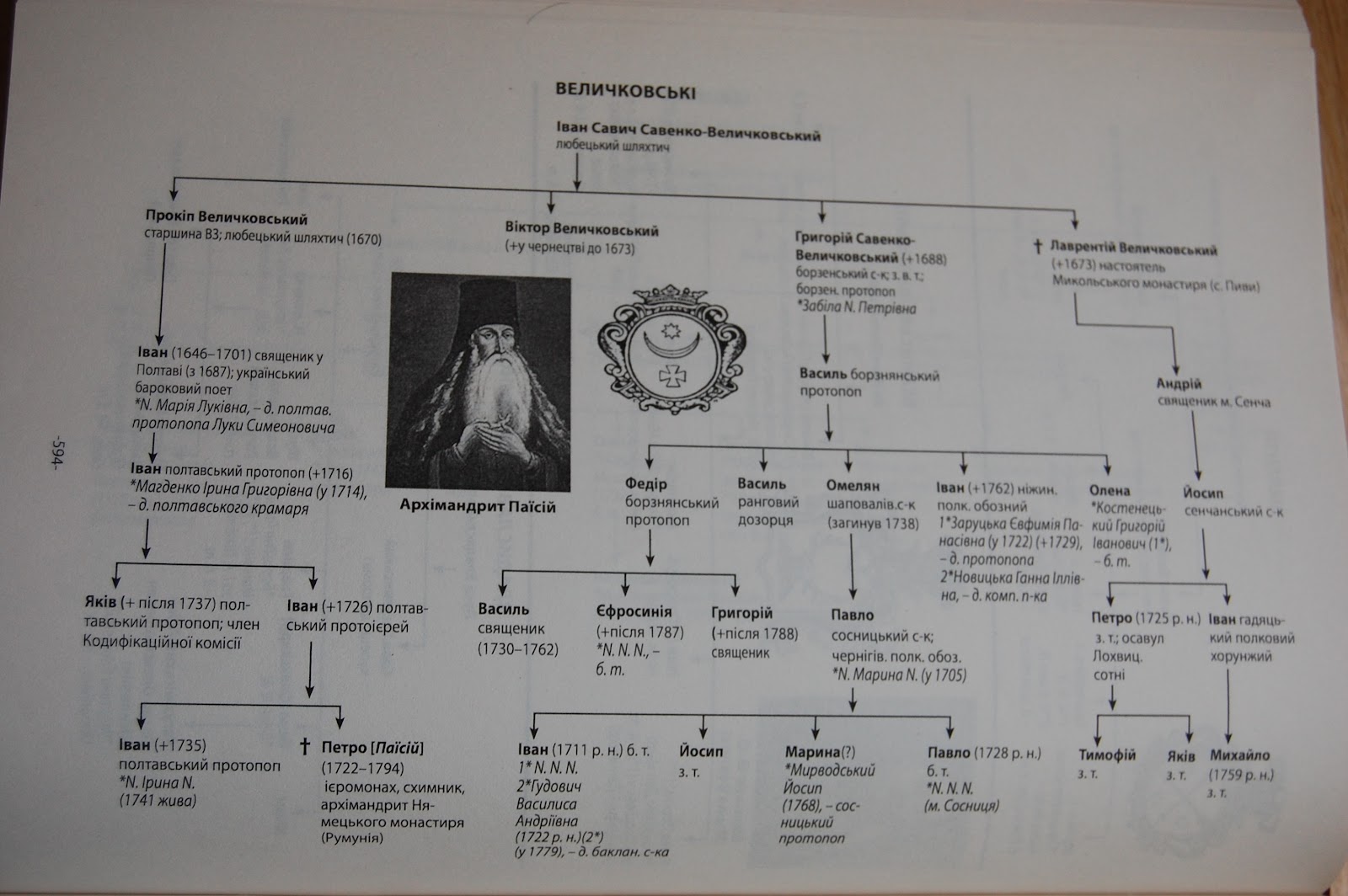Как и другие знатные полтавцы XVIII в., Петр Величковский происходит от участников казацкой революции 40-х годов XVII века. По отцовской линии он принадлежал к казацкой элите и духовенству. В своей автобиографии Паисий назвал одного из своих предков со стороны отца: его "прапрадед, знатный и богатый казак Семион" 11 , живший, вероятно, в 40 - 50-х годах XVII века. Сын Семиона, прадед преподобного, Лука Семионович был первым из полтавских протопопов этой семьи.